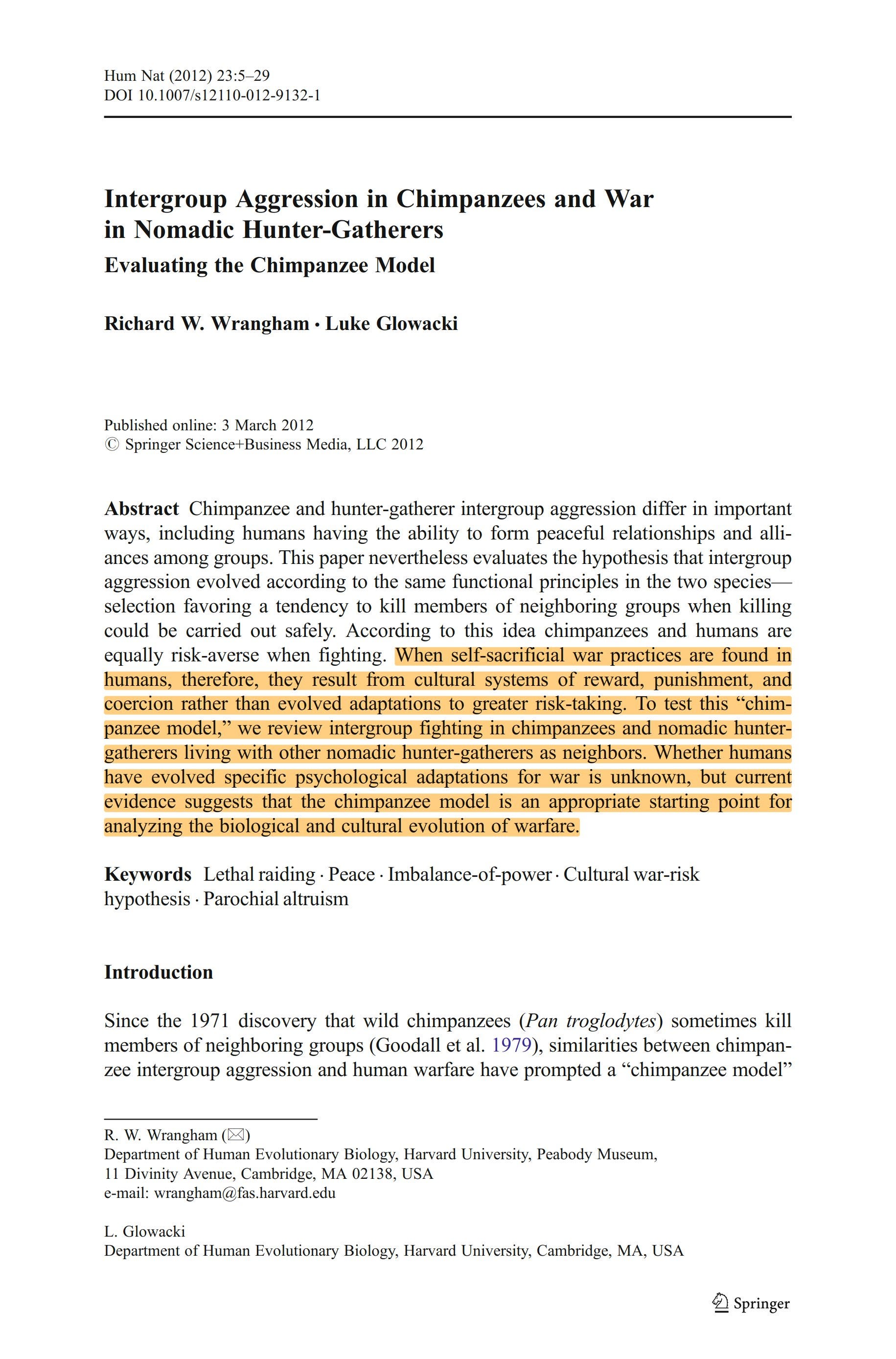 Wrangham, R. W., & Glowacki, L. (2012). Intergroup Aggression in Chimpanzees and War in Nomadic Hunter-Gatherers: Evaluating the Chimpanzee Model. Human Nature, 23(1), 5-29. https://doi.org/10.1007/s12110-012-9132-1