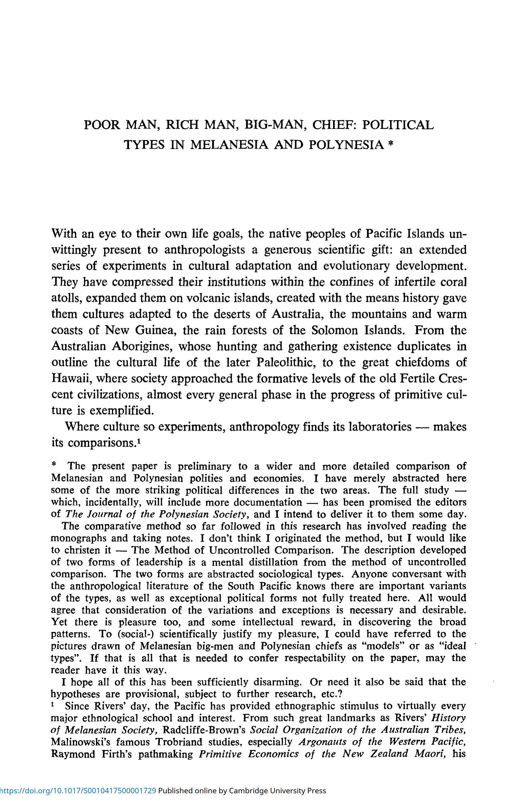Sahlins, M. D. (1963). Poor Man, Rich Man, Big-man, Chief: Political Types in Melanesia and Polynesia. Comparative Studies in Society and History, 5(3), 285-303. https://doi.org/10.1017/S0010417500001729