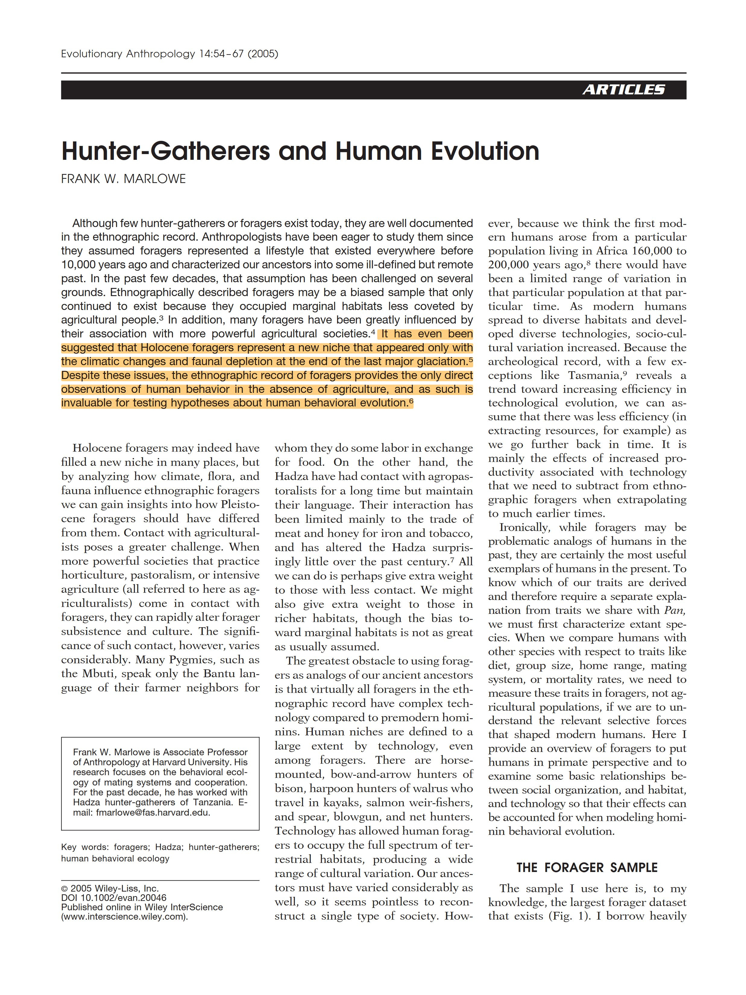 Marlowe, F. W. (2005). Hunter-gatherers and human evolution. Evolutionary Anthropology: Issues, News, and Reviews, 14(2), 54-67. https://doi.org/10.1002/evan.20046