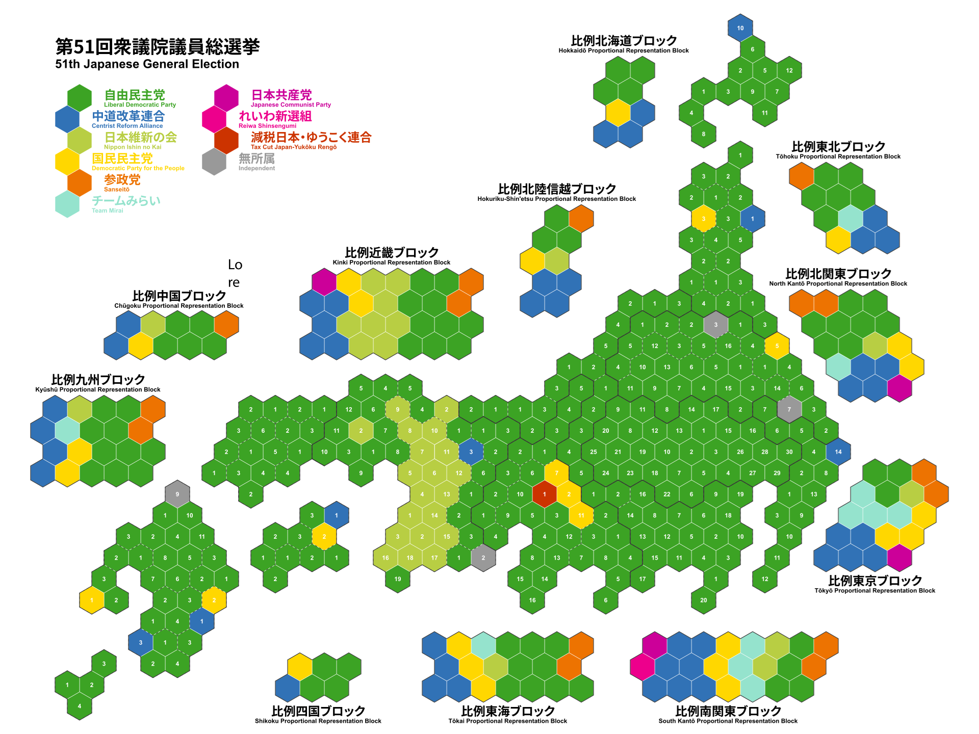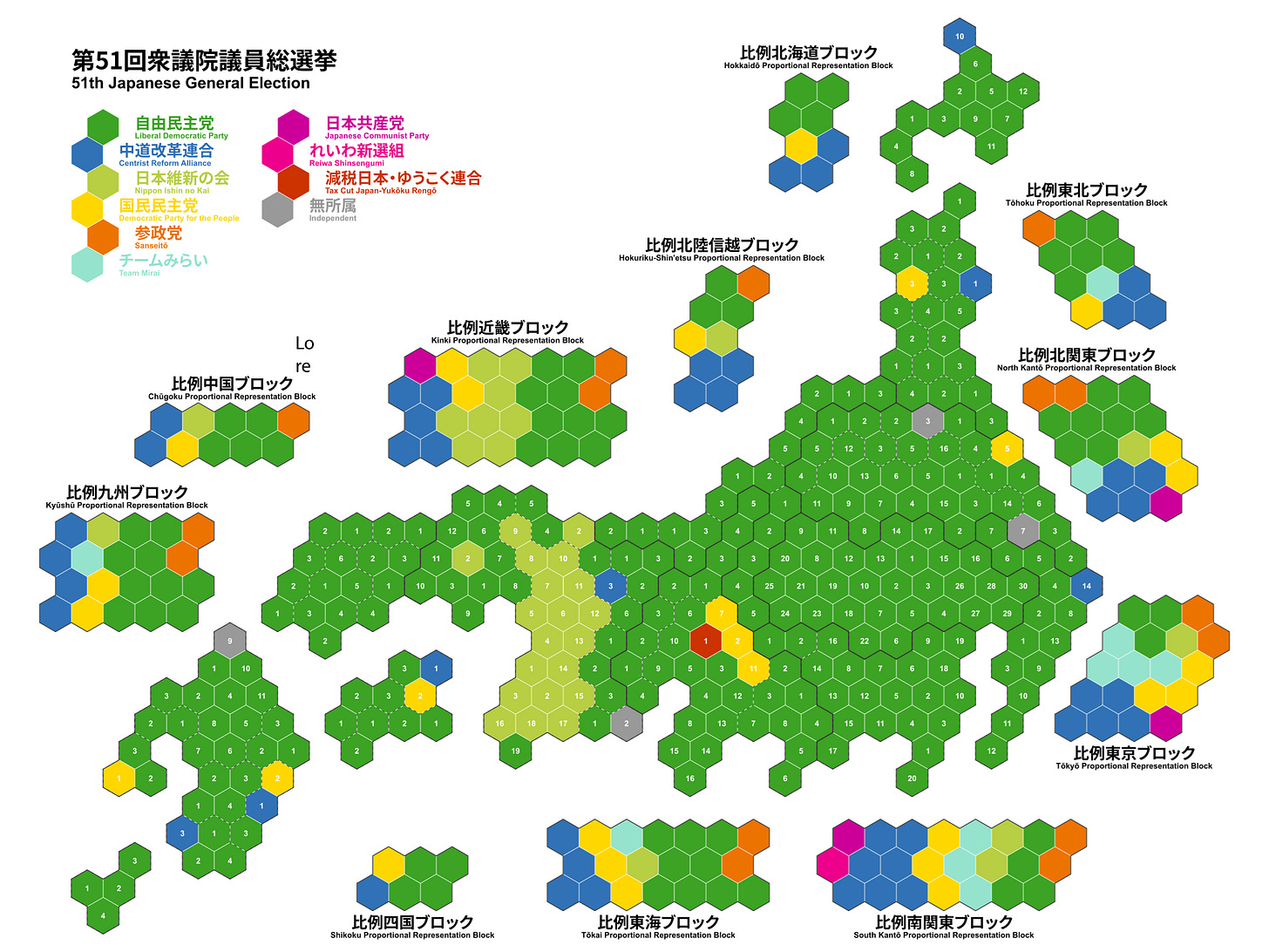 Reiwa Shinsengumi(れいわ新選組): Reiwa için felaket bir seçim; %7'den %3'e düşerek neredeyse tüm temsil güçlerini kaybettiler. Temsiciler Meclisi’nde sadece tek bir üyeleri olacak