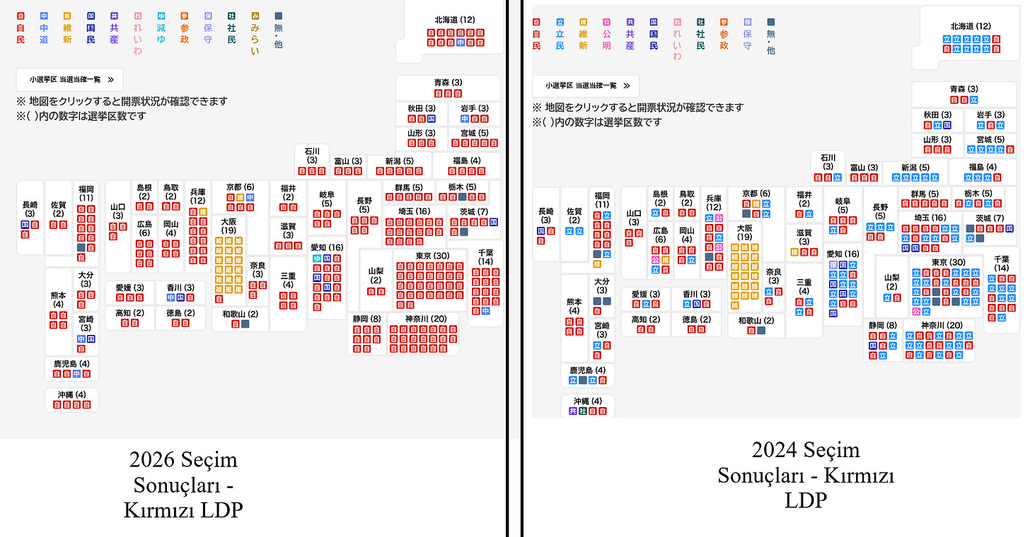 Sol tarafta 2026 haritası, sağ tarafta ise 2024 haritası yer alıyor; aradaki farklar hemen göze çarpıyor. Yakından bakıldığında görülebileceği üzere, ana değişimler Japonya'nın doğu ve kuzey kesimlerinde gerçekleşti. Osaka'dan (ortadaki o büyük sarı blok: Ishin no Kai/Japonya Yenilik Partisi kontrolünde) doğuya doğru olan bölge, Japon muhalefetinin geleneksel olarak daha güçlü olduğu yerdir; ancak bu seçimde varlık gösteremediler.