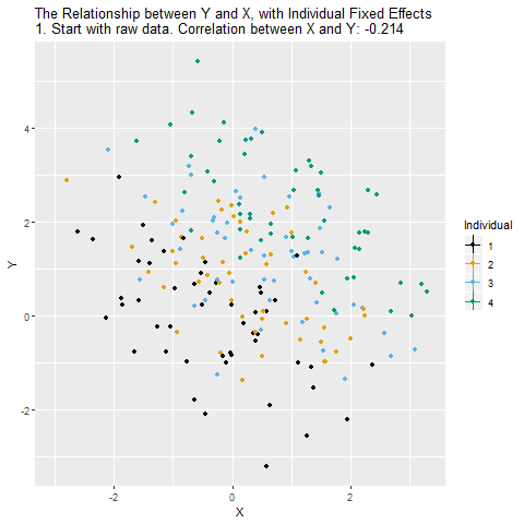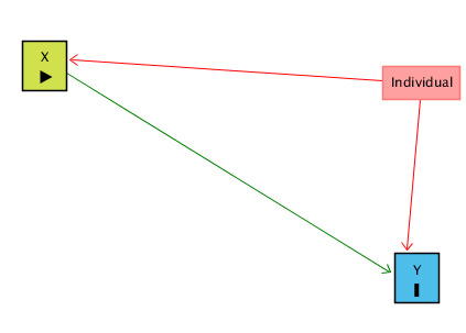 Peki X ile Y arasındaki ilişkiye bireyin kendi içinde nasıl bakabiliriz? Bunu kontrol ederek yaptığımız şey, X ve Y’nin bireysel kimlikler tarafından açıklanan kısımlarını çıkarmaktır. X ve Y’nin birey kimlikleriyle tahmin edilebilecek tüm kısımları çıkarılır, böylece bu arka kapı/gizli yol kapanmış olur ve X ile Y’yi sadece birey içi karşılaştırmalarla incelemiş oluruz.