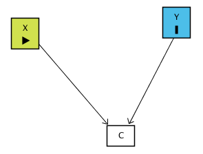 Aşağıdaki diyagramda gösterildiği gibi: Diyelim ki X ve Y arasında doğrudan bir ilişki yok fakat her ikisi de C isimli bir değişkeni etkiliyor. C’ye bu yüzden “collider” denir çünkü oklar C’de çarpışır: