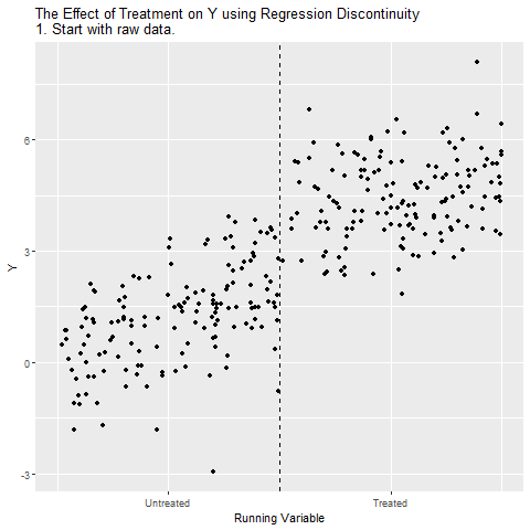 Grafikte Running Variable (ör. sınav puanı) yatay eksende, Y (ör. üniversiteye gitme) dikey eksende. Eşik değeri çizgisi (dikey kesikli çizgi) eşik değerini gösteriyor. Eşik değerin solundakiler işlemi/treatment almıyor, sağındakiler alıyor. Ham veride hem Running Variable’ın hem de Treatment’in etkileri iç içe geçmiş durumda.