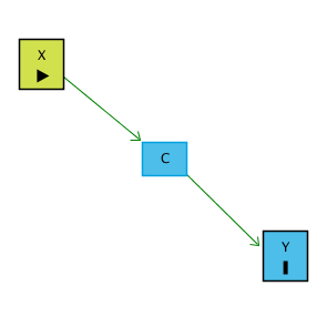 C’yi kontrol ettiğimizde, X ile Y arasındaki nedensel etki “kapatılmış” oluyor. Çünkü X’in Y üzerindeki etkisi zaten C üzerinden geçiyordu. Dolayısıyla sanki X ile Y arasında hiçbir ilişki yokmuş gibi görünüyor.