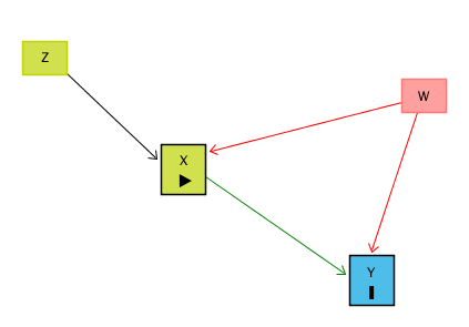 Burada ortaya çıkan gizli yolu kapatmak için W’yi kontrol etmek gereklidir. Başka bir deyişle, X ile Y arasındaki ilişkiye bakarken W’nin etkisini çıkarırız. Bunu da şu şekilde yaparız:
