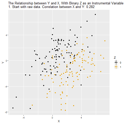 İlk karede X ile Y arasındaki ham ilişki gösteriliyor. Noktaların rengi Z’nin (araç değişken) iki değerini (0 = siyah, 1 = turuncu) temsil ediyor. Burada görülen korelasyon (0.282), X’in Y üzerindeki gerçek etkisini tam olarak yansıtmıyor çünkü karıştırıcı değişkenlerin (W) etkisi de işin içinde.
