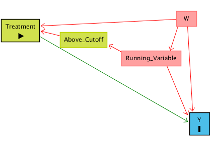 Aşağıdaki figür bunu gösteriyor: Running Variable yanında başka bir değişken W de Y’yi etkiliyor olabilir, ama eşik değeri çevresinde karşılaştırma yaptığımızda bu yol da kapanır ve izole edilmiş yol Treatment → Y kalır