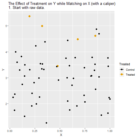 Ham veriyle başlıyoruz: İlk karede ham veriyi görüyoruz. Turuncu noktalar Treatment alan gözlemleri, siyah noktalar ise kontrol grubunu temsil ediyor. Burada gözlenen farklar hem İşlemin gerçek etkisini hem de X’in karıştırıcı etkisini içeriyor.