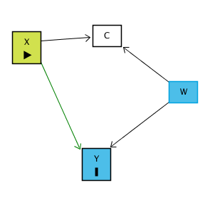Bu durumda X → C ← W → Y gibi bir yol vardır. Normalde bu yol kapalıdır, yani sorun yoktur. Ama eğer C’yi kontrol edersek, collider yolu açılır ve X ile Y arasında sahte bir ilişki ortaya çıkar. Örneğin aşağıdaki gibi: