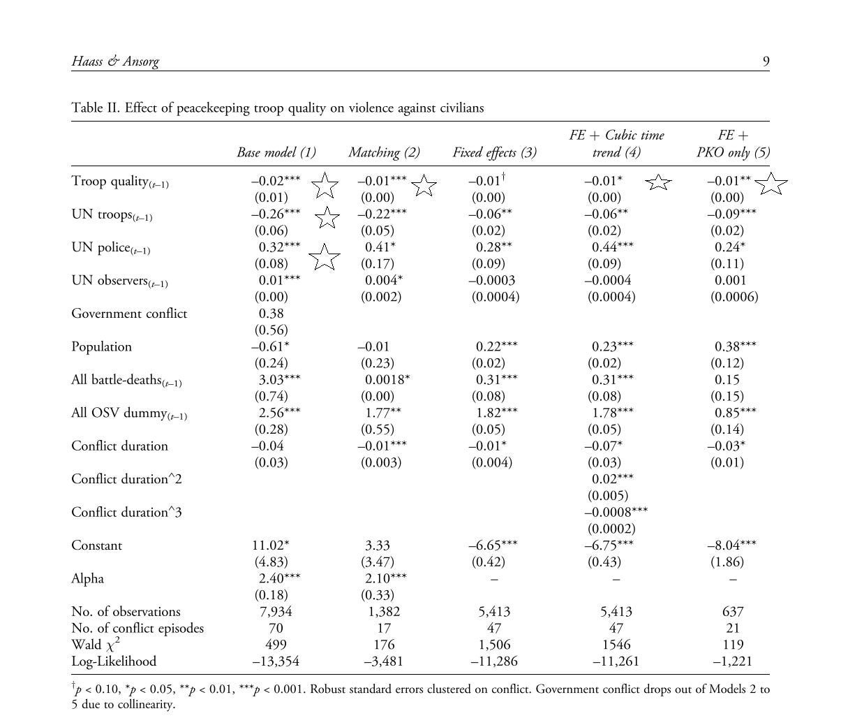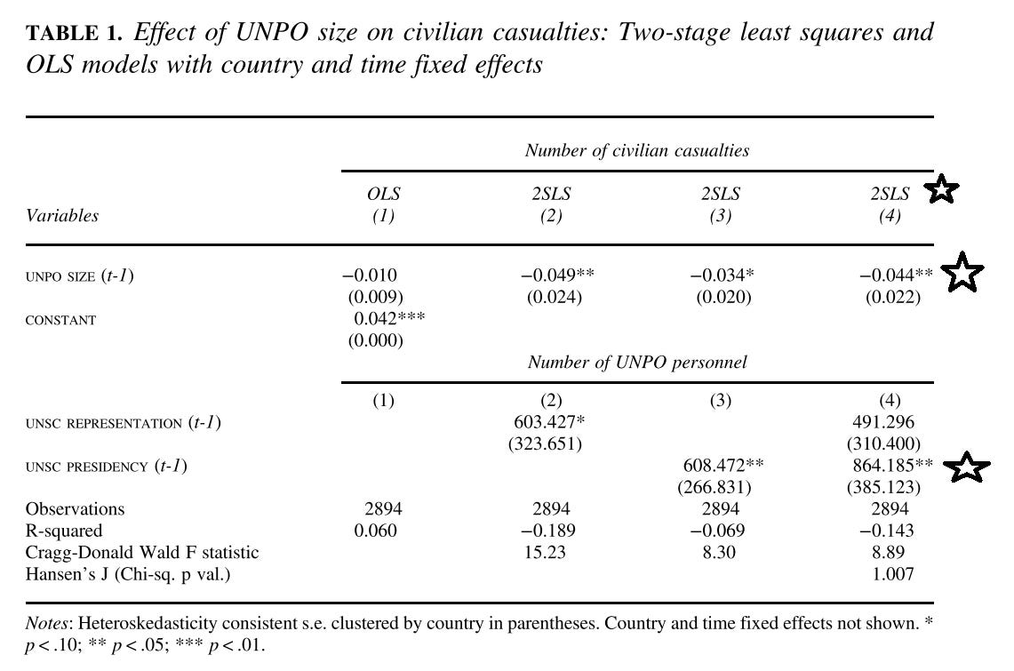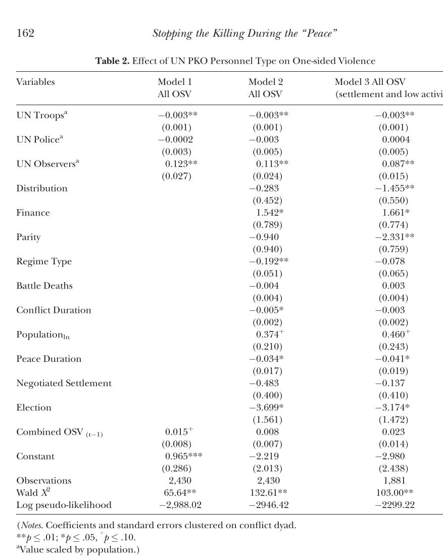Çıkarttıkları sonuç öncekilerle neredeyse aynı. Birleşmiş Milletler Gözlemcilerinin sayısı sivillere olan şiddetle ters orantılı değil. Lakin asker kalitesi, hem asker hem polis sayısı ile beraber sivillere karşı gerçekleşen şiddetle ters ilişkili ve 4 modelde de istatistiksel olarak önemli (en düşüğü +p<0.10, %10 hata payı ama diğerlerinde %5 ve %1’e yaklaşıyor).