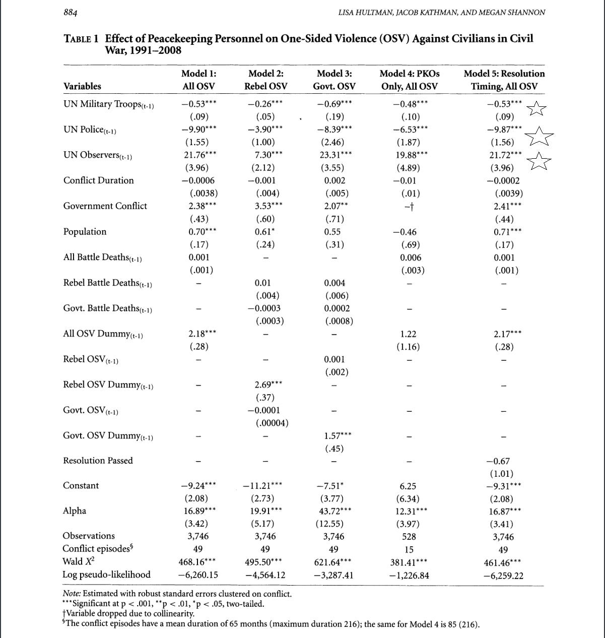 Kullandıkları her modelde (1991-2008 yılları arasında gerçekleşen her barışı koruma görevinde), UN Police (askerler) & UN Police (polis) sayısındaki artışın, hükümet ve isyancıların tek taraflı şiddetinde ölen sivillerin sayısını istatisksel olarak anlamlı derecede azalttığını göstermiş(P<.001*** yani %1 hata payıyla). Lakin bir şeyin her modelde dikkatinizi çekmesi gerek. UN Observers (gözlemciler) sayısındaki her artış, sivil ölümüyle pozitif ilişki içerisinde. Askeri birliklerin ve polisin sivil ölümlerini azalttığını bulsak da, BM Gözlemcileri için katsayı ters yöne işaret ediyor ve daha fazla gözlemci konuşlandırmasının mağduriyeti artırdığını gösteriyor. Gözlemcilerin varlığı, genel olarak, BM'nin savaş süreçlerini gözlemleme yeteneğini geliştiriyor.; lakin gözlemciler üç türden (asker, polis & gözlemci) en zayıf yetkilendirilmiş olanla gruptur. Şiddete yanıt verecek fiziksel kapasiteleri yoktur (Hultman, Kathman & Shannon, 2013, 886). Bu nedenle sayılarındaki artış sivillerin korunmasını beraberinde getirmez.