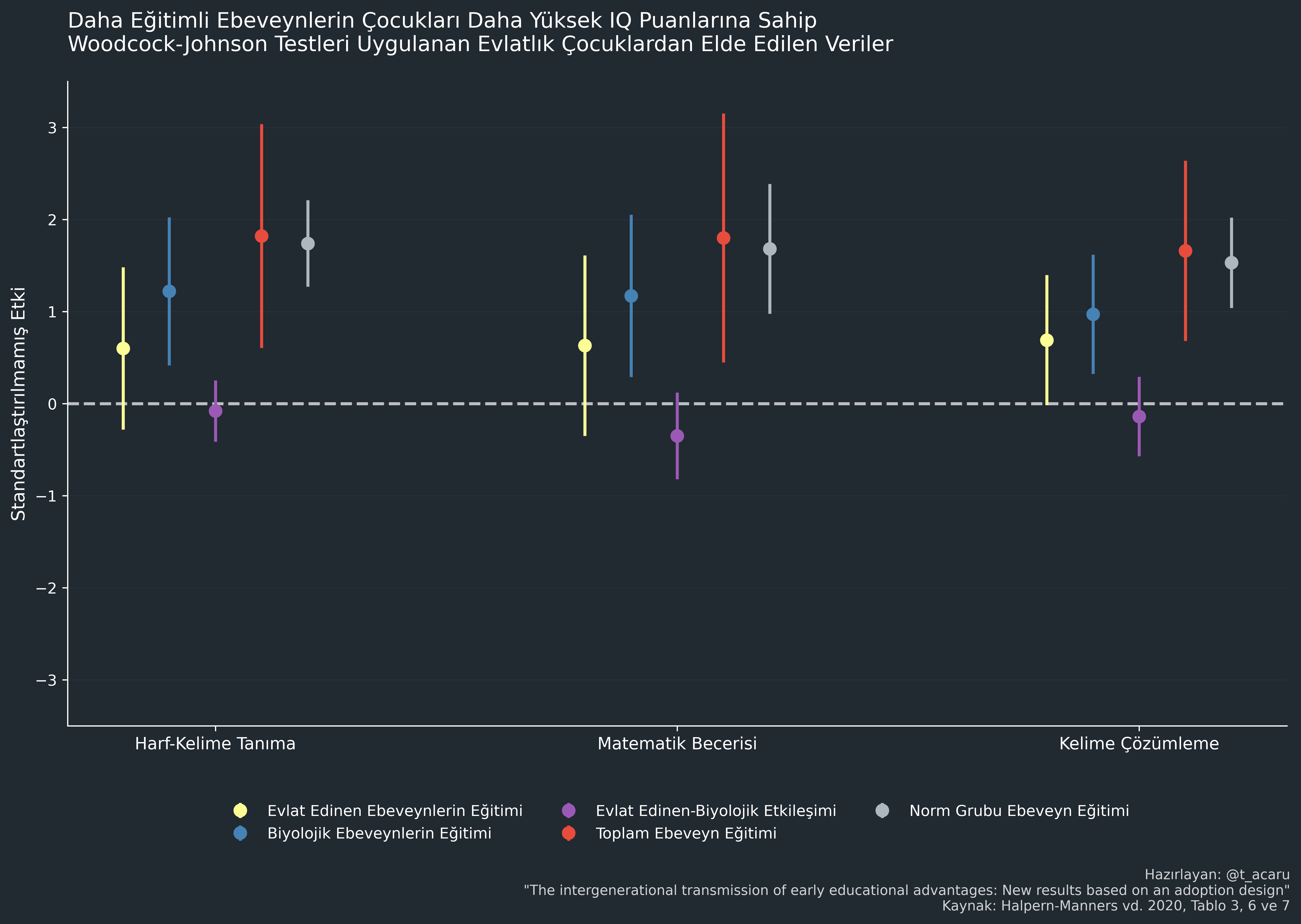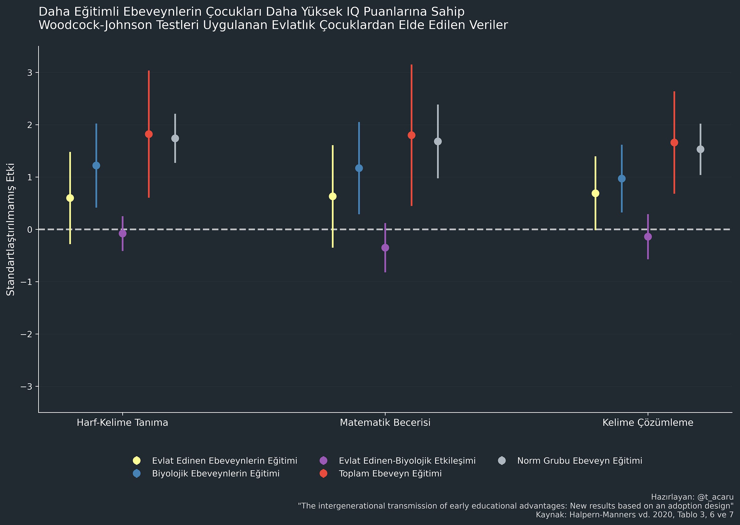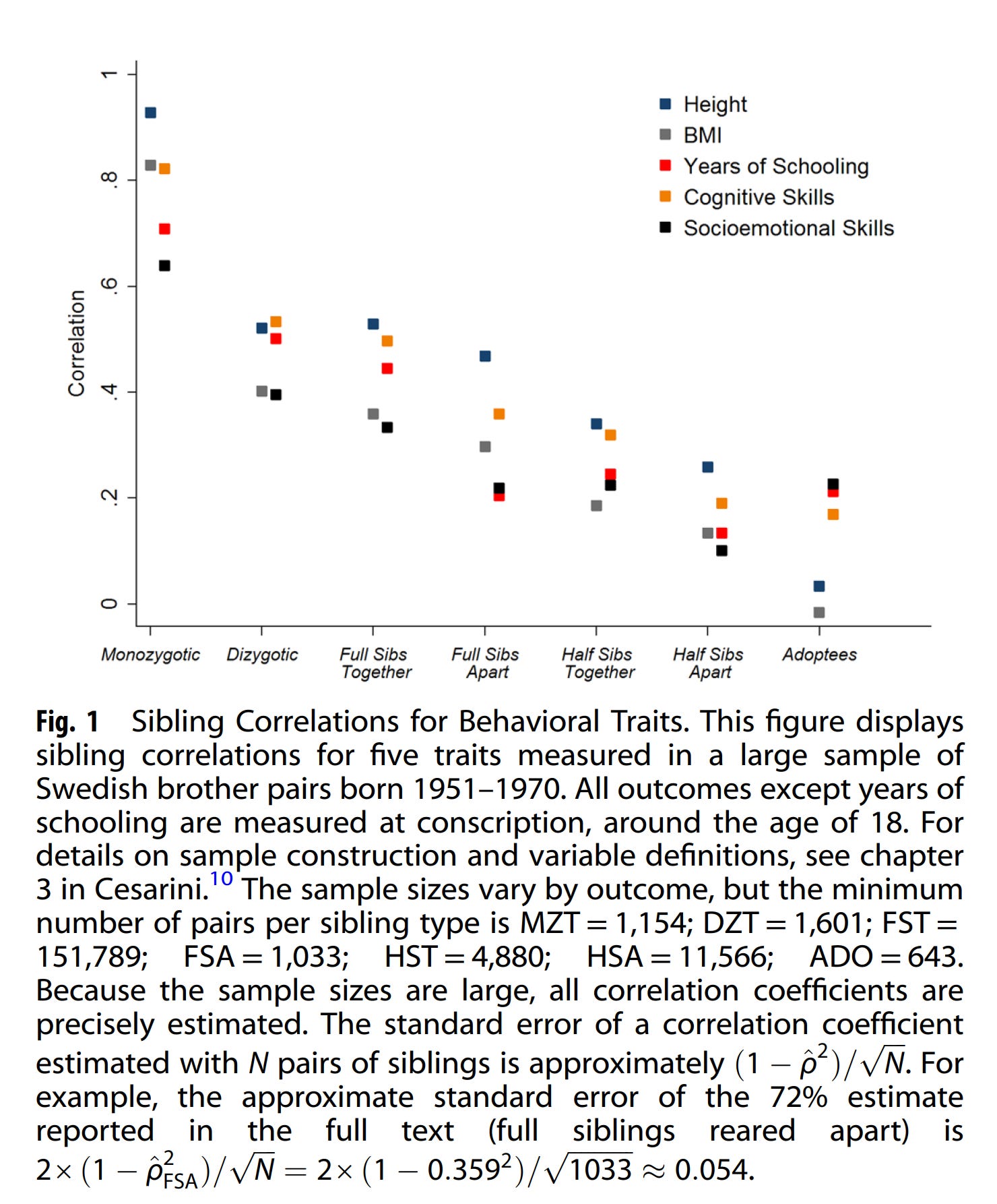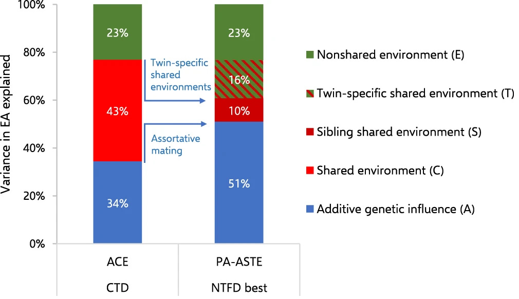 İkiz ve biyolojik kardeş modelleri için yapılan ölçümler ayırt edilemez derecede benzerdir,ama C varyansı ("Aile ortamı") için yapılan ölçümler evlatlık (adoptee) modellerinde daha düşük çıkmıştır. Güven aralıkları (CI) oldukça genişti ve negatif değerlere ulaştıklarında yazarların bunları sıfırda sabitlemeyi seçmesi hatalıydı; yine de en yüksek istatistiksel güce sahip model (biyolojik kardeş modeli) her iki evlatlık modeliyle karşılaştırıldığında, etki büyüklükleri anlamlı derecede farklıydı (evlatlık-kardeş ve evlatlık-ebeveyn modelleri için p değerleri sırasıyla 0.0035 ve 0.0119). Eğer tahminleri etrafında bir simetri varsayarsak, C varyansı tahminleri çok hassas olmadığı için bu durum her iki model için de artık geçerli olmayacaktır.