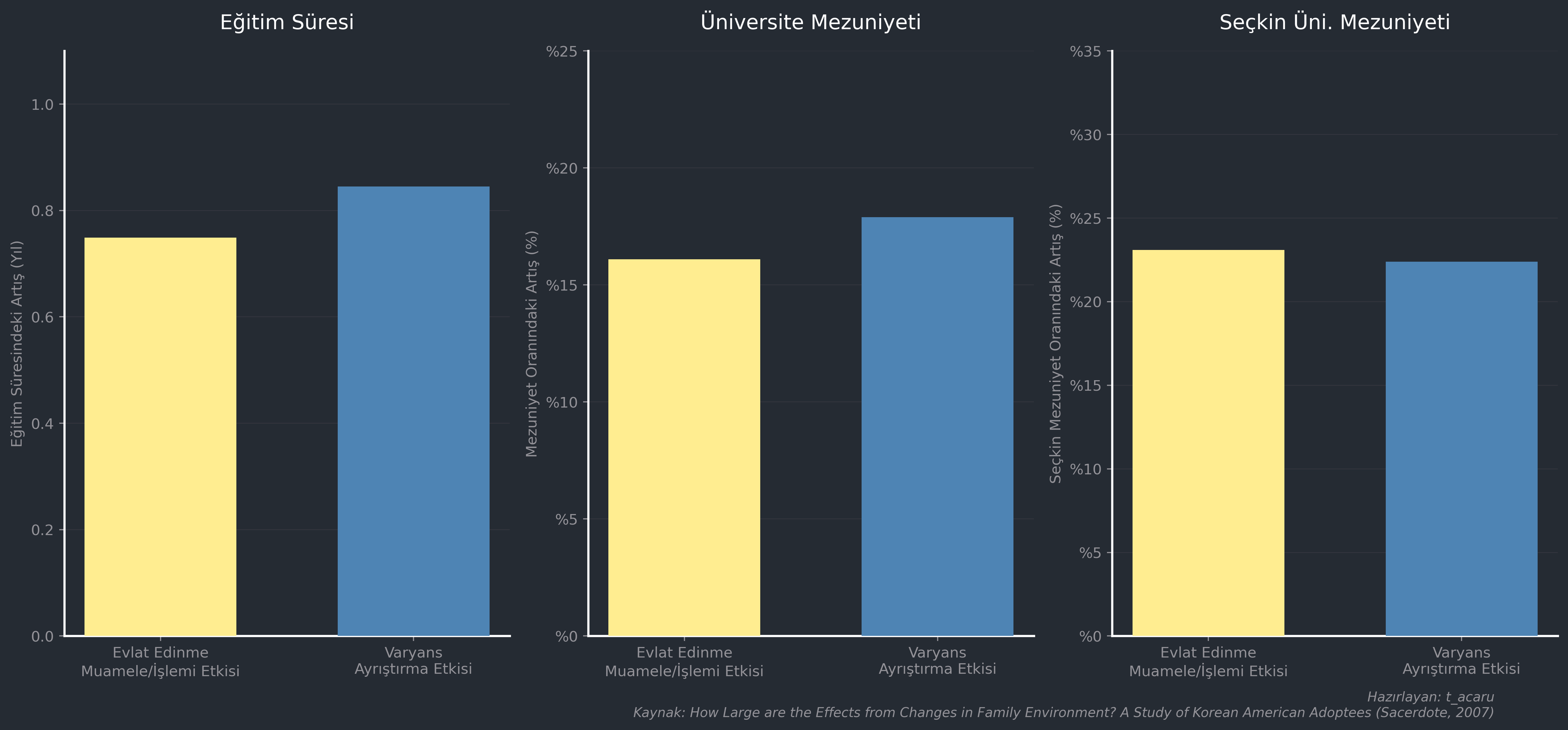 Sacerdote’un çalışmasında, yüksek eğitimli ve küçük bir aileye yerleştirilmenin tahmini etkisinin; daha yüksek eğitim alma (örneğin lise bitirince 12 yıl, lisans bitirince 16 yıl, YL bitirince 18 yıl gibi), herhangi bir üniversiteden mezun olma olasılığının artması ve seçkin bir üniversiteden mezun olma olasılığının yükselmesi şeklinde eğitim başarısında önemli bir artışa yol açtığı bulunmuştur (“Evlat Edinme Muamele/İşlem Etkisi”). Evlat edinen ailedeki paylaşılmayan çevre (C) kalitesinde bir standart sapma yukarı çıkmanın etkisi de buna oldukça benzer çıkmıştır (“Varyans Ayrıştırma Etkisi”).