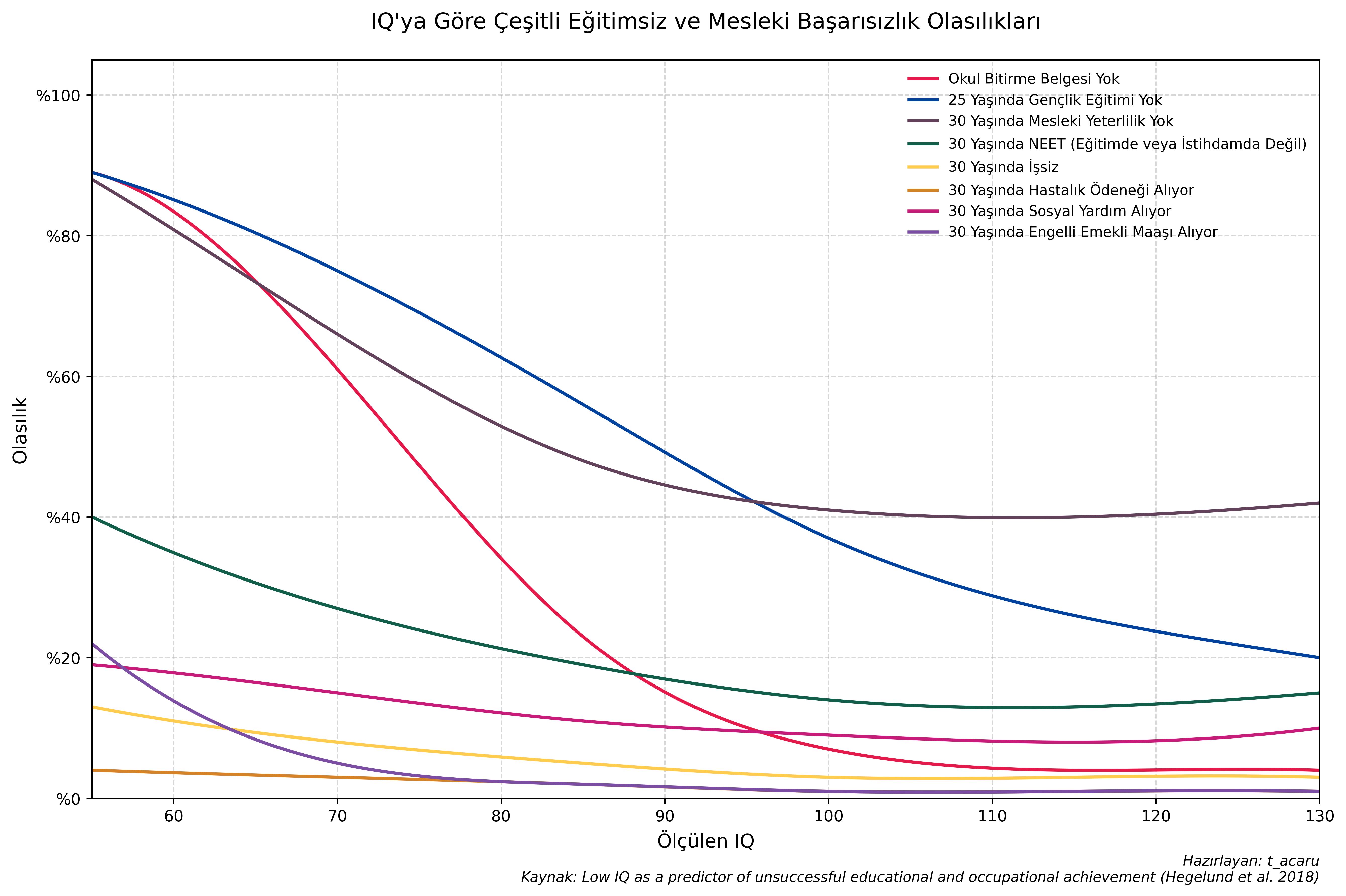 Danimarka’da 1 milyondan fazla erkeğin verileriyle yapılan kapsamlı bir çalışma, düşük IQ seviyesinin (özellikle 80 ve altı) okul bırakma, işsizlik, sosyal yardıma bağımlılık ve düşük gelir gibi başarısızlık göstergeleriyle çok güçlü bir korelasyon içinde olduğunu kanıtlamaktadır (Hegelund vd. 2018). İstatistiksel olarak varyansın sadece %5-10’unu etkileyen çevresel iyileştirmeler bile, bireyleri bu kritik risk barajlarının üzerine çıkararak onların sosyal ve ekonomik kaderini kökten değiştirebilir; bu da bize "küçük" görünen çevresel etkilerin, aslında toplumsal müdahale ve eğitim planlaması için en stratejik noktalar olduğunu söylemektedir.