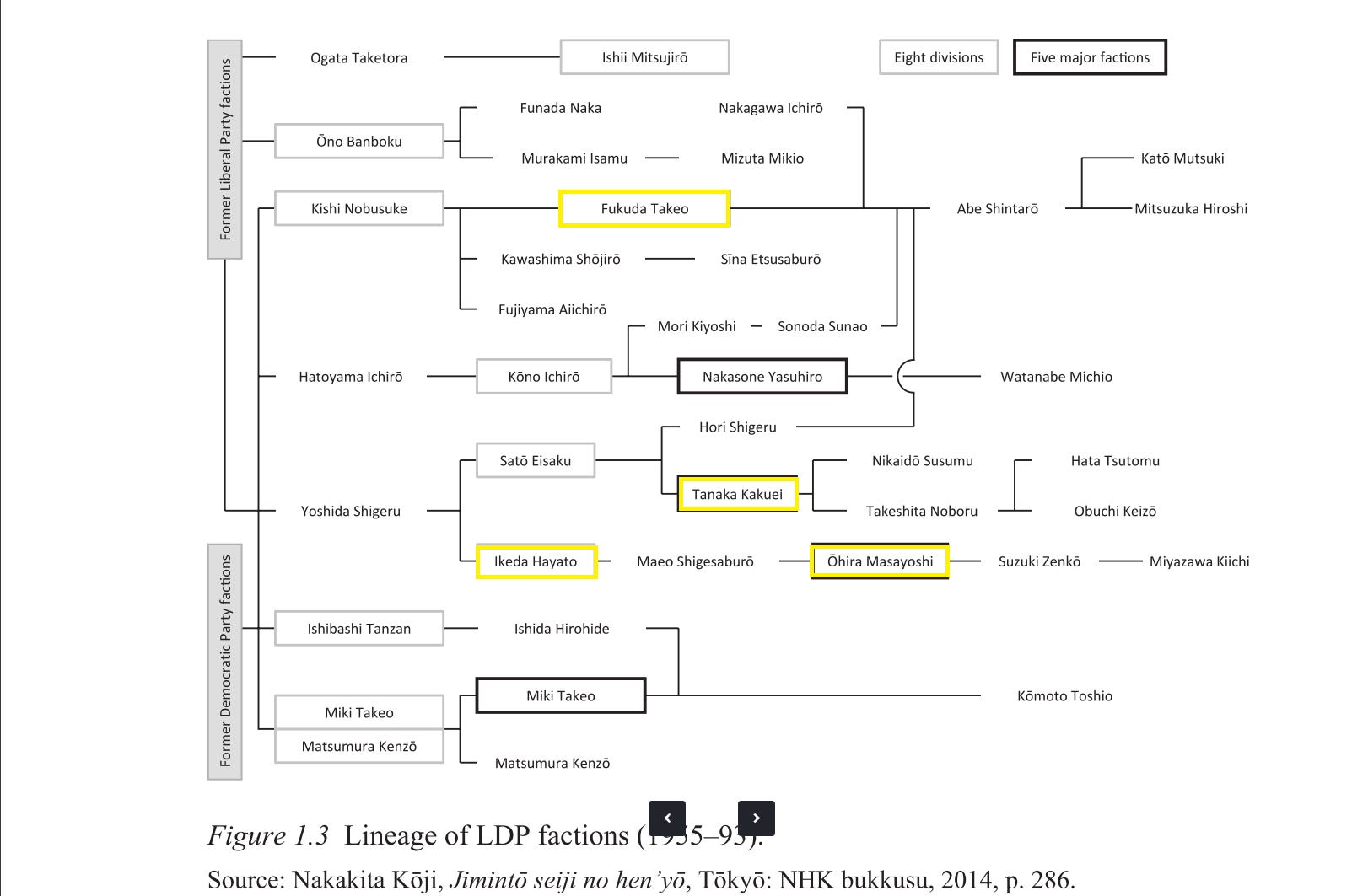 Liberal Parti ve Demokratik Parti birleştiğinde, her iki parti kendi içerisinden önemli isimleri bünyesinde topladı ve çok sayıda fraksiyon ortaya çıktı. Bu fraksiyonların çoğu tarihlerini 1955 yılına kadar takip edebiliyor. Bu yazı için güncel olarak en büyük üç fraksiyona bakacağım. Kishi Nobusuke ve Fukuda Takeo’ya kadar uzanan Seiwa Seisaku Kenkyuukai; Tanaka Kakukei’ye uzanan Thursday Club (Heisei Kenkyuukai/ Heiseiken); İkeda Hayato ve Oohira Masayoshi’ye kadar uzanan Kouchikai.