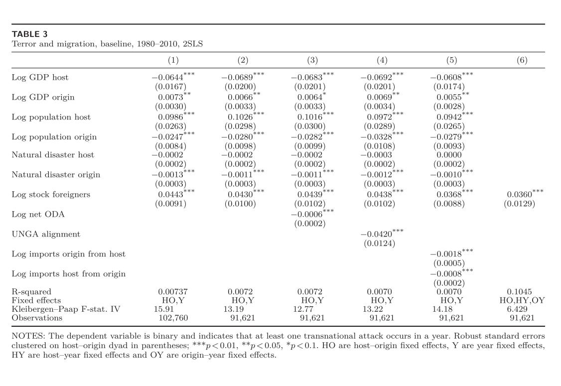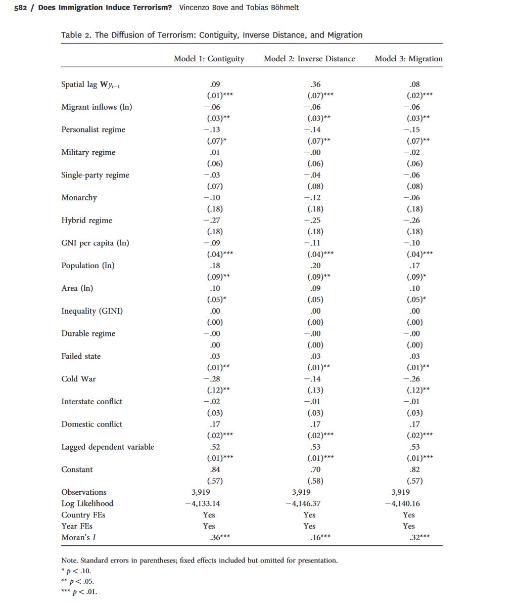 Güncel olarak, iki tane large-N çalışması (gördüğüm en iyi iki güncel çalışma), göçün hedef ülkede göçün terör üzerindeki etkisini araştırıyor. Birincisi Bove and Böhmel’in çalışması. Araştırmacılar, 1970-2000 (yılın sıkıntılı olduğunu buradan anlayabilirsiniz) yılları arasında 145 ülkeden veri topluyor (göçmenlerle ilgili, bağımlı değişken) ve Global Terrorism Database verisetini kullanarak bağımsız değişkenlerini elde ediyorlar. Formülü buraya yazamıyorum; lakin çalışmanın 577. sayfasında görebilirsiniz.
