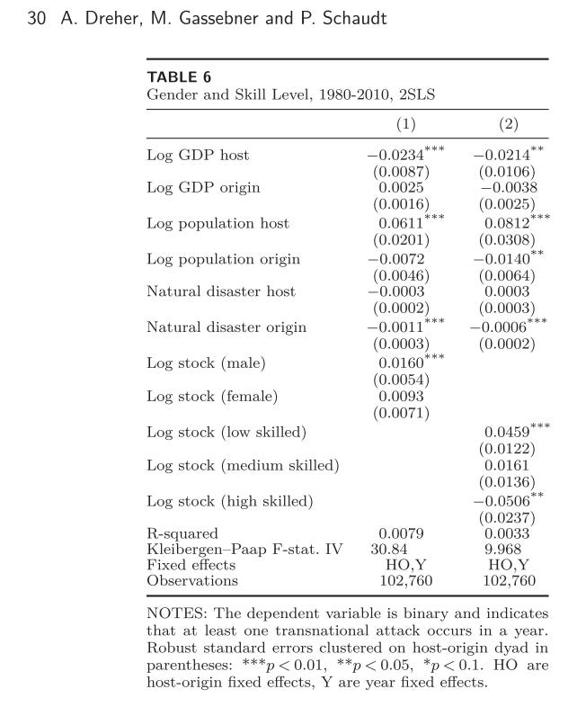 Tablonun (s.23) sütunları (1,2,3,4,5,6) sırasıyla: (1)-(2) iki bileşenli (binary- gerçekleşti mi gerçekleşmedi mi) bir indikatör ve yılda en az bir kere gerçekleşen terör saldırısını; (3) sütun bir yılda gerçekleşen ulusötesi saldırının sayısını; (4) sütununda ikili gösterge (gerçekleşti mi gerçekleşmedi mi), belirli bir yılda en az bir kişinin yaralanması veya öldürülmesiyle sonuçlanan ulusötesi bir terör saldırısını; (5) en az bir kişinin yaralanması veya öldürülmesiyle sonuçlanan saldırıların sayısını; Sütun (6) toplam ölüm sayısını gösterir. Sonuçlar pek iç acıcı değil. Görüldüğü gibi, yabancı sayısında her %1 artış, 0.0443 (Log Stock Foreigners) oranında saldırı olma potansiyelini arttırıyor ve diğer birçok şeyi (ölümle sonuçlanan saldırıyı (4), o saldırıların sayısını (5) ve toplam ölüm sayılarını (6) ) arttırıyor.