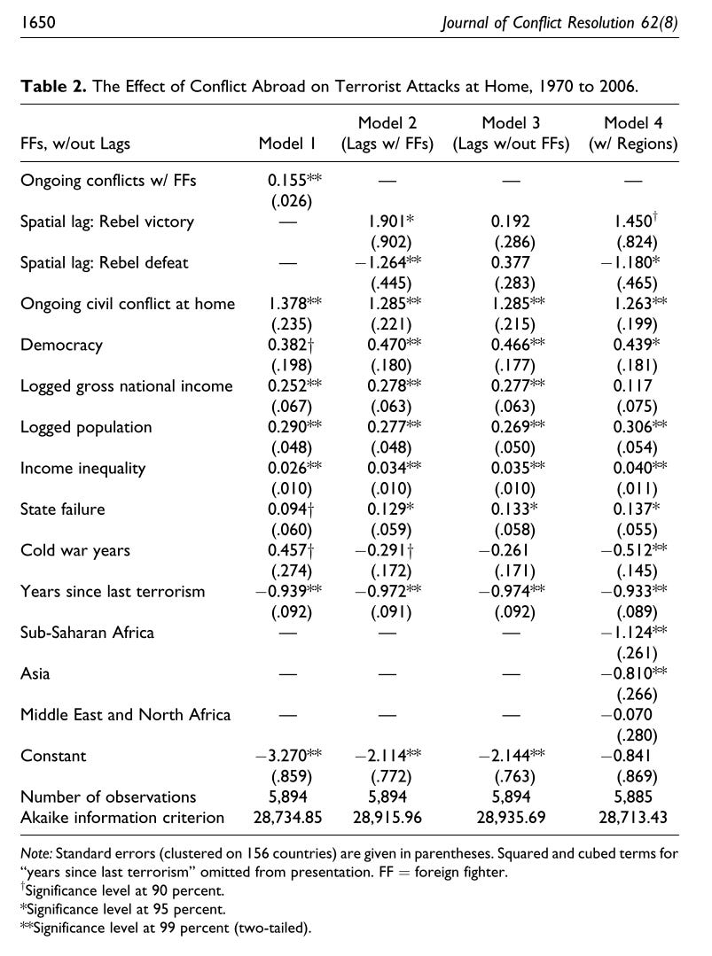 Tablo 2 çok açık bir şekilde hipotezlerini doğruluyor. Model 1, devam eden savaşlarda FF’ler varsa, ana ülkelerde terörizm riskinin doğrudan artacağını gösteriyor. Model 2’de yabancı savaşçıları içeren iç savaşlara iki mekansal gecikme (spatial lag) değişkeni etkleniyor: "FF'lerle isyan zaferi" ve "FF'lerle isyan yenilgisi". Bu model, Hipotez 2 ve 3'ün ilk testini sağlıyor. 2'den 4'e kadar olan modellerde, mekansal gecikme değişkenleri, yurt dışında herhangi bir çatışmanın olmadığı ve devam eden çatışmalarla karşılaştırıldığında, yurt dışında sona eren çatışmaların etkisini göstermektedir (basitçe savaşlar bitmiş durumda). FF'leri de içeren isyancıların zaferiyle sonuçlanan yurt dışındaki iç çatışmalar, ana ülkede terörizmin artmasıyla ilişkilendiriliyor. Aynı zamanda, yurt dışındaki FF çatışmalarında isyancıların yenilgilerinin, içeride terörizmin azalmasıyla ilişkili olduğunu görüyoruz. Bu iki bulgu, hipotez 2 ve 3’ü doğruluyor.