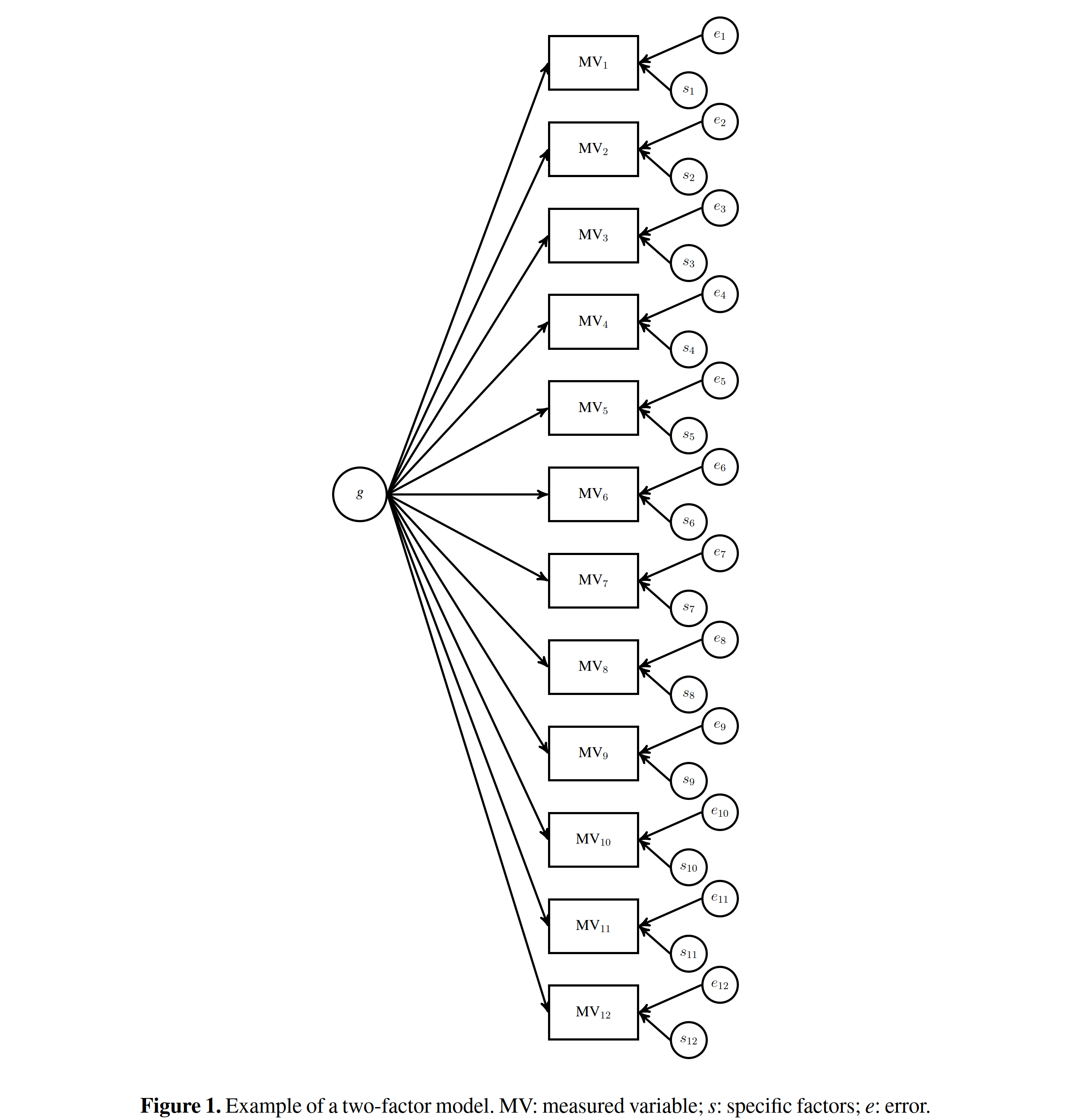 Sizin için okuyayım: Sol tarafta bir tane genel (g) faktör var. Bu genel faktör MV yani ölçülen değişkenlerle ölçülüyor. Ölçülen değişkenlerin (MV) sağ tarafında spesifik faktörler (s) ve ölçüm hatası (e) var.