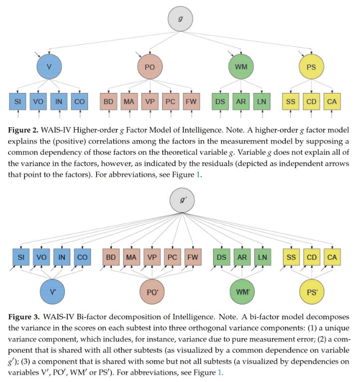 Kalan diğer iki modeli karşılaştırmalı olarak inceleyelim. İlki higher-order (ikinci-düzey) g modeli, ikincisi bi-factor g modeli.