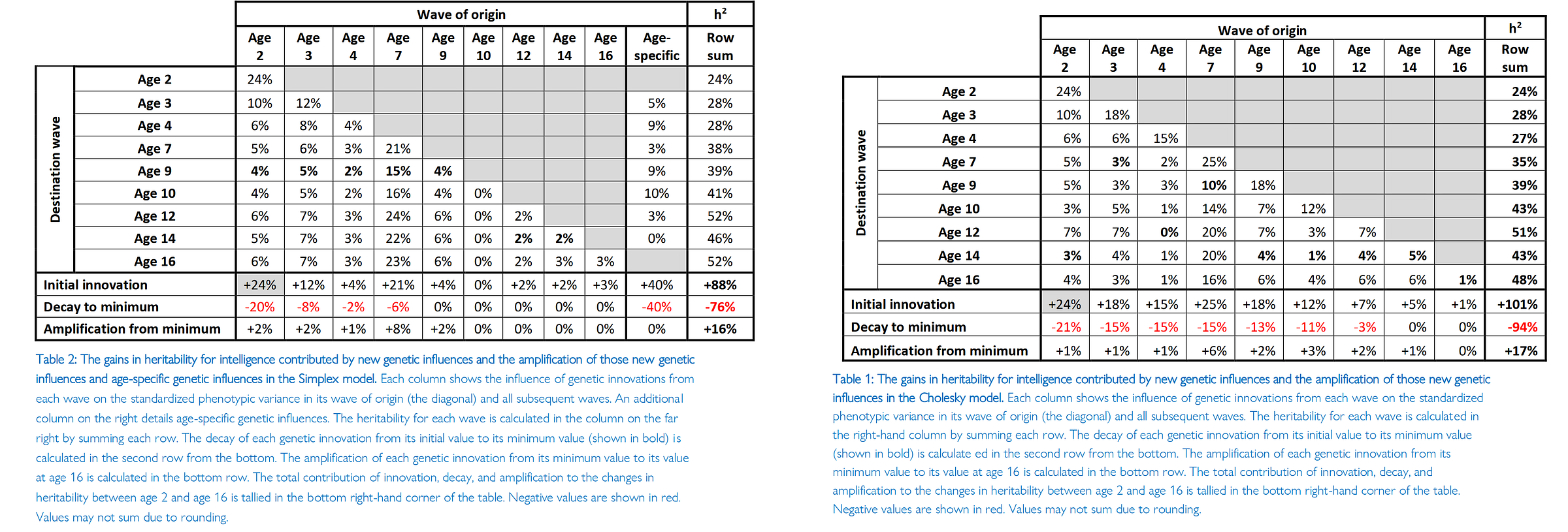 Morris vd. tarafından yapılan çalışma bunun kesinlikle doğru olduğunu buldu, özellikle de erken çocuklukta. Kalıtsallıktaki artışın büyük bir kısmı, beyin geliştikçe devreye giren yeni genetik faktörlerden kaynaklanıyor. Fakat her şeyi açıklamıyor.