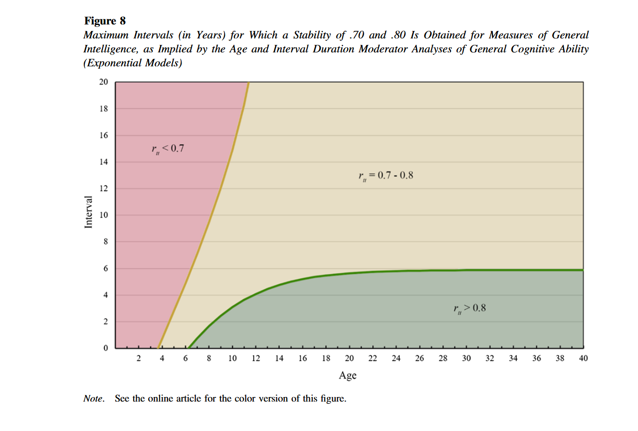 Örneğin: Küçük çocuklarda, bu stabilite sadece 7 yaşından sonra ve “kısa zaman aralıkları” için beklenir. Örneğin, 6 yaşında, bir test skoru bu r=.80 eşiğini yalnızca yaklaşık bir yıllık bir test-tekrar test aralığı için karşılıyor. Daha büyük çocuklarda, skor daha stabil hale gelir. 12 yaşında, skor yaklaşık dört yıl boyunca ‘geçerli’ sayılır. Yetişkinlerde stabilite çok yüksektir. Bu rtt=.80 kriteri 5 yılı aşan aralıklar için karşılanır. 18 yaşına gelindiğinde, bir skor bu seviyede altı yıldan fazla bir süre boyunca stabil kalır.
