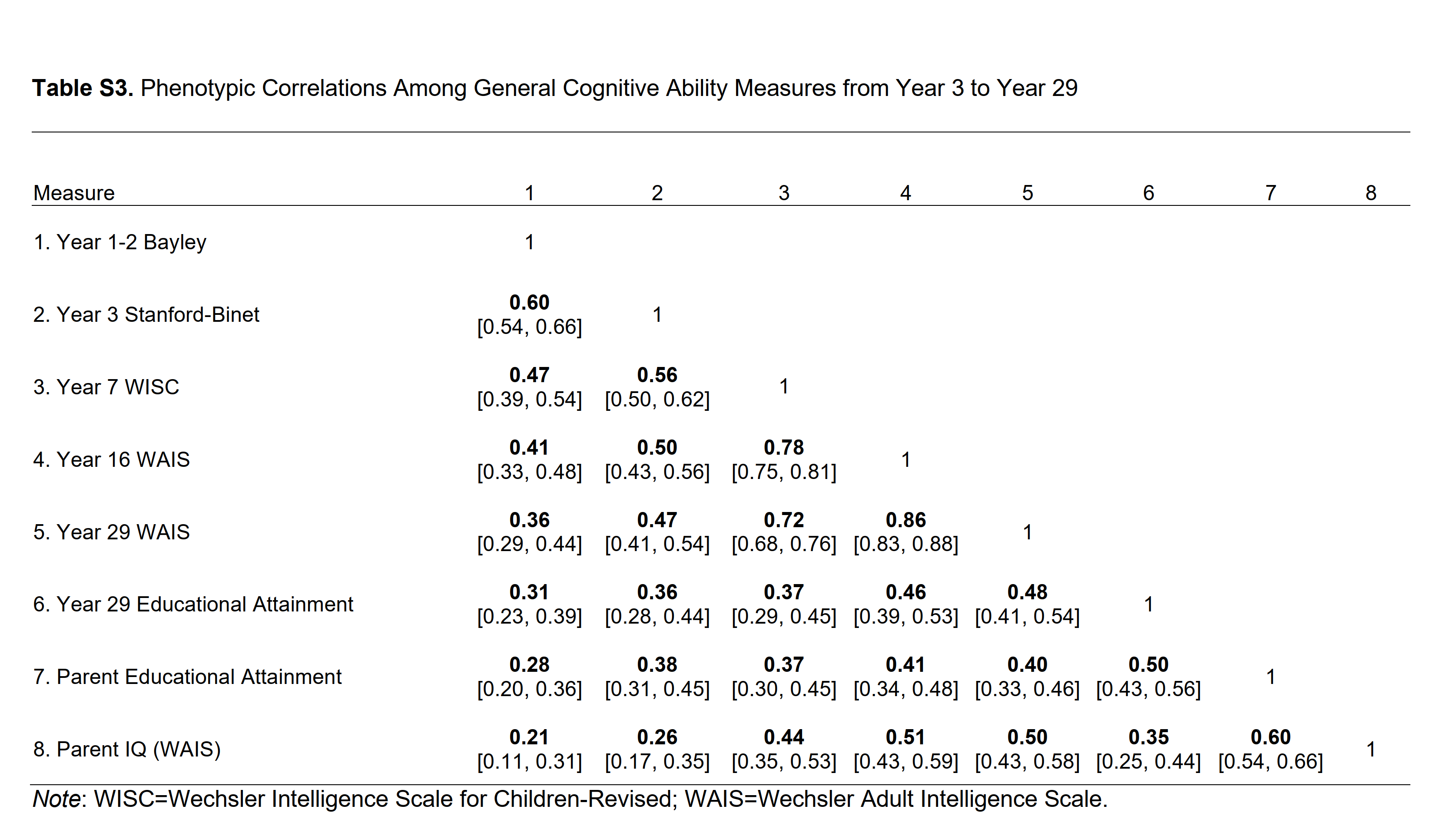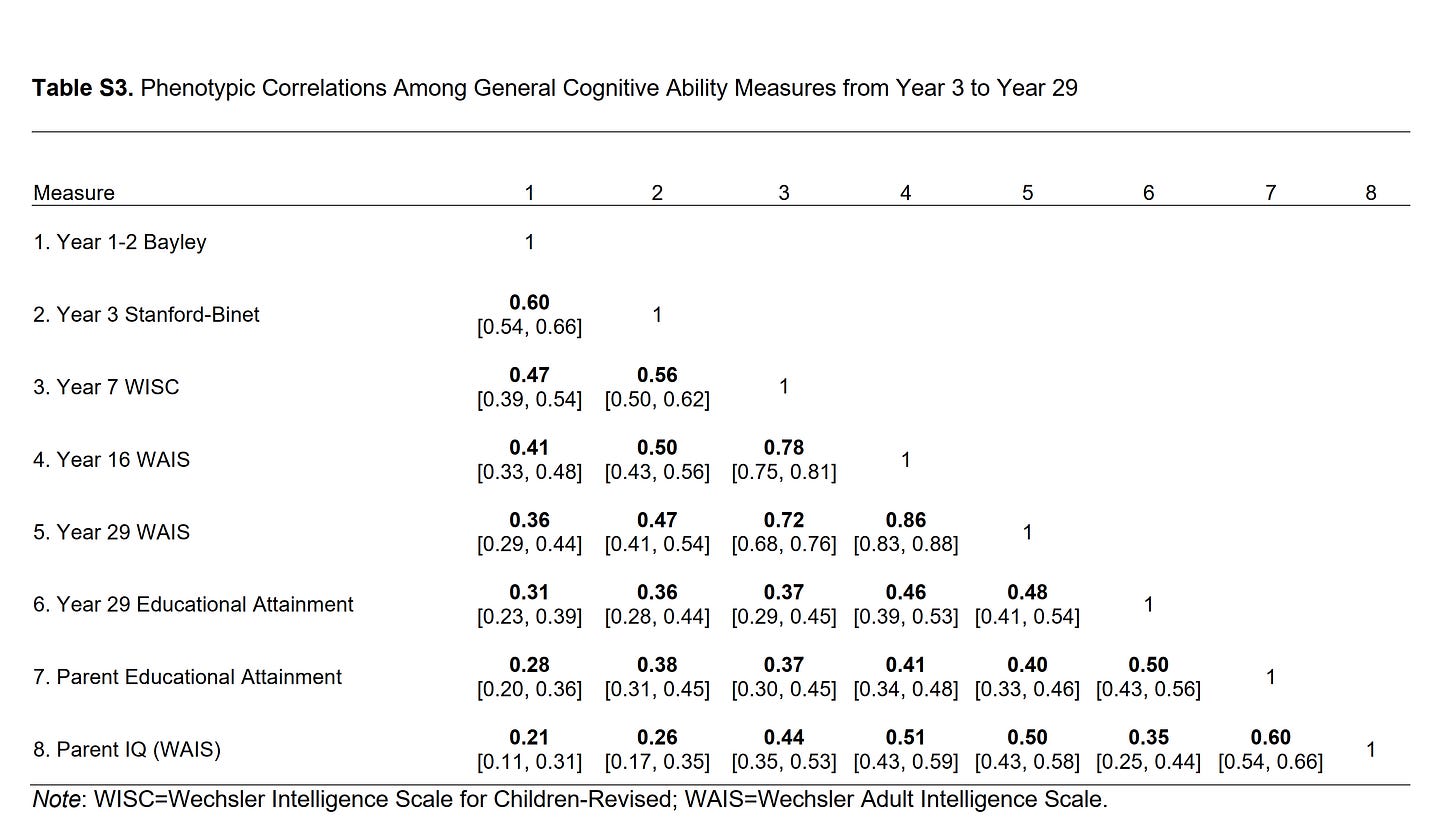 Stabilite kısmı ise biraz daha ilginç. Gustavson vd. Breit ve arkadaşlarının tanımladığı tam olarak aynı stabilizasyon modelini kendi tek örneklemlerinde replike ediyor. Farklı yaşlardaki GCA puanlarını 29 yaşındaki nihai yetişkinlik puanıyla karşılaştırıyorlar.